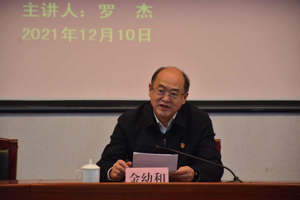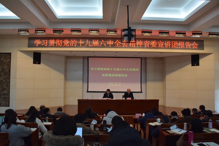 12月10日上午,按照省委安排部署,学习贯彻党的十九届六中全会精神省委宣讲团宣讲报告会在白菜官网举行,省委宣讲团成员,省委宣传部原常务副部长、省人民政府参事罗杰同志作宣讲报告。学校党委书记金幼和同志主持报告会并就持续学习宣传贯彻好全会精神提出要求。学校在家校领导、全体中层干部、党史学习教育领导小组全体成员、校级宣讲团成员以及部分师生代表200余人现场聆听了报告。