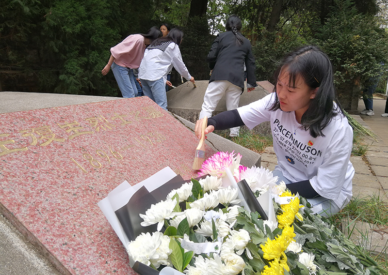 在烈士纪念园,三位党员同志分别讲述了王德三、吴澄和马登云烈士的英雄事迹,带领同学们深刻领悟了革命先辈用生命诠释共产党员的坚定意志和崇高品质;在庄严肃穆的烈士墓前,党员们面对鲜艳的党旗,庄严的举起右手,在杨岚同志的带领下重温入党誓词,缅怀先烈,牢记宗旨、不忘初心;在支部书记姚丽媛同志的带领下,同志们向烈士敬献鲜花,鞠躬致敬,缅怀他们的丰功伟绩。大家还细心地清扫每一座墓碑,整理敬献的鲜花……用行动向先烈致敬。
